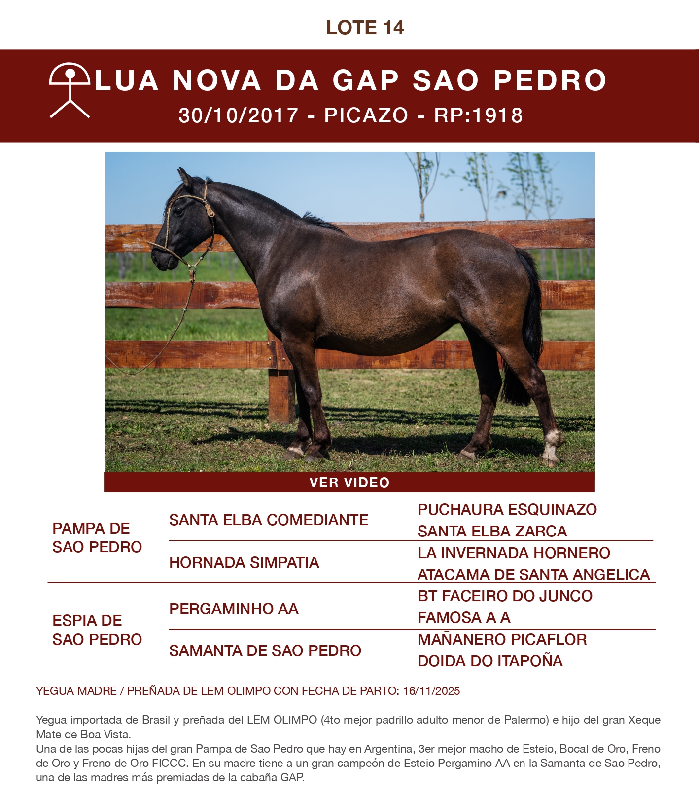 LOTE 14, LUA NOVA DA GAP SAO PEDRO Lote Anterior Volver al remate Lote Siguiente Ficha Contacto Ofertar Buenos Aires - Ficha del Lote Identificador: #343922 Categoría: Yeguas RP: 1918 Pedigree Descripción: Alzada 1,42 Costilla 1,97 Caña 0,18 Buenos Aires - Ofertar Fecha de cierre: 14 de Octubre a las 13:30hs. Aún no tiene ofertas Plazo: Contado 30 días 45 días 60 días 90 días 120 días 180 días Contado, 30 y 60 dias Su Oferta en $: − + Step: -20.000,00 / +20.000,00 Programar puja hasta: Programar puja hasta Aumentar puja programada 340000 700000 **Oferta al bulto Iniciar sesión para ofertar Ofertar Compra por $ 99.000.000,00 Ofertas Recibidas $ Fecha/Hora Estado Este lote aún no tiene preofertas. ¿Estás seguro de comprar el LOTE LUA NOVA DA GAP SAO PEDRO por $ 99000000 ? 106 Visualizaciones ClicData Contacto Empresa: El Rincón Criollos Nombre*: Teléfono* : E-mail* : Mensaje Enviar Registrese gratis Este contenido Exclusivo está disponible sólo para usuarios registrados Ingresar