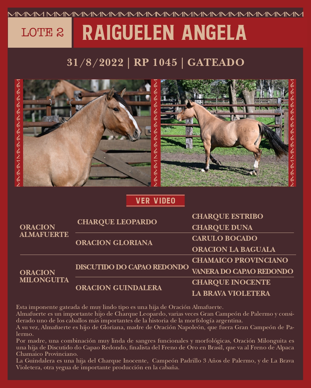 LOTE 2, RAIGUELEN ANGELA Lote Anterior Volver al remate Lote Siguiente Ficha Contacto Ofertar Buenos Aires - Ficha del Lote Identificador: #344807 Categoría: Yeguas RP: 1045 Pedigree Buenos Aires - Ofertar Fecha de cierre: 20 de Octubre a las 14:00hs. Aún no tiene ofertas Plazo: Contado 30 días 45 días 60 días 90 días 120 días 180 días Contado, 30 y 60 dias Su Oferta en $: − + Step: -20.000,00 / +20.000,00 Programar puja hasta: Programar puja hasta Aumentar puja programada 390000 750000 **Oferta al bulto Iniciar sesión para ofertar Ofertar Compra por $ 99.000.000,00 Ofertas Recibidas $ Fecha/Hora Estado Este lote aún no tiene preofertas. ¿Estás seguro de comprar el LOTE RAIGUELEN ANGELA por $ 99000000 ? 188 Visualizaciones ClicData Contacto Empresa: El Rincón Criollos Nombre*: Teléfono* : E-mail* : Mensaje Enviar Registrese gratis Este contenido Exclusivo está disponible sólo para usuarios registrados Ingresar