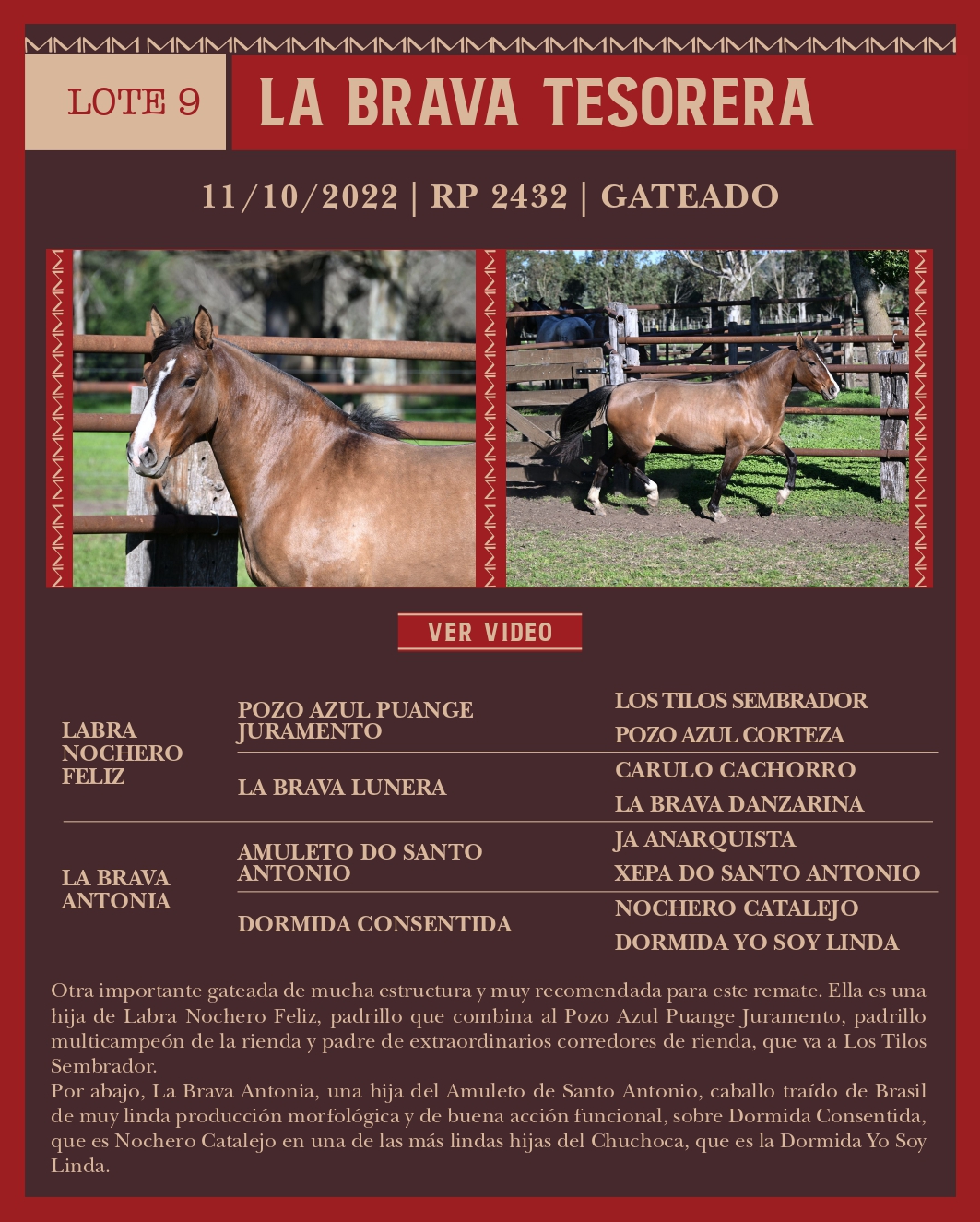 LOTE 9, LA BRAVA TESORERA 🔥 🔥 🔥 Lote Anterior Volver al remate Lote Siguiente Ficha Contacto Ofertar Buenos Aires - Ficha del Lote Identificador: #344814 Categoría: Yeguas RP: 2432 Pedigree Buenos Aires - Ofertar Fecha de cierre: 20 de Octubre a las 14:00hs. Aún no tiene ofertas Plazo: Contado 30 días 45 días 60 días 90 días 120 días 180 días Contado, 30 y 60 dias Su Oferta en $: − + Step: -20.000,00 / +20.000,00 Programar puja hasta: Programar puja hasta Aumentar puja programada 540000 900000 **Oferta al bulto Iniciar sesión para ofertar Ofertar Compra por $ 99.000.000,00 Ofertas Recibidas $ Fecha/Hora Estado Este lote aún no tiene preofertas. ¿Estás seguro de comprar el LOTE LA BRAVA TESORERA por $ 99000000 ? 264 Visualizaciones ClicData Contacto Empresa: El Rincón Criollos Nombre*: Teléfono* : E-mail* : Mensaje Enviar Registrese gratis Este contenido Exclusivo está disponible sólo para usuarios registrados Ingresar
