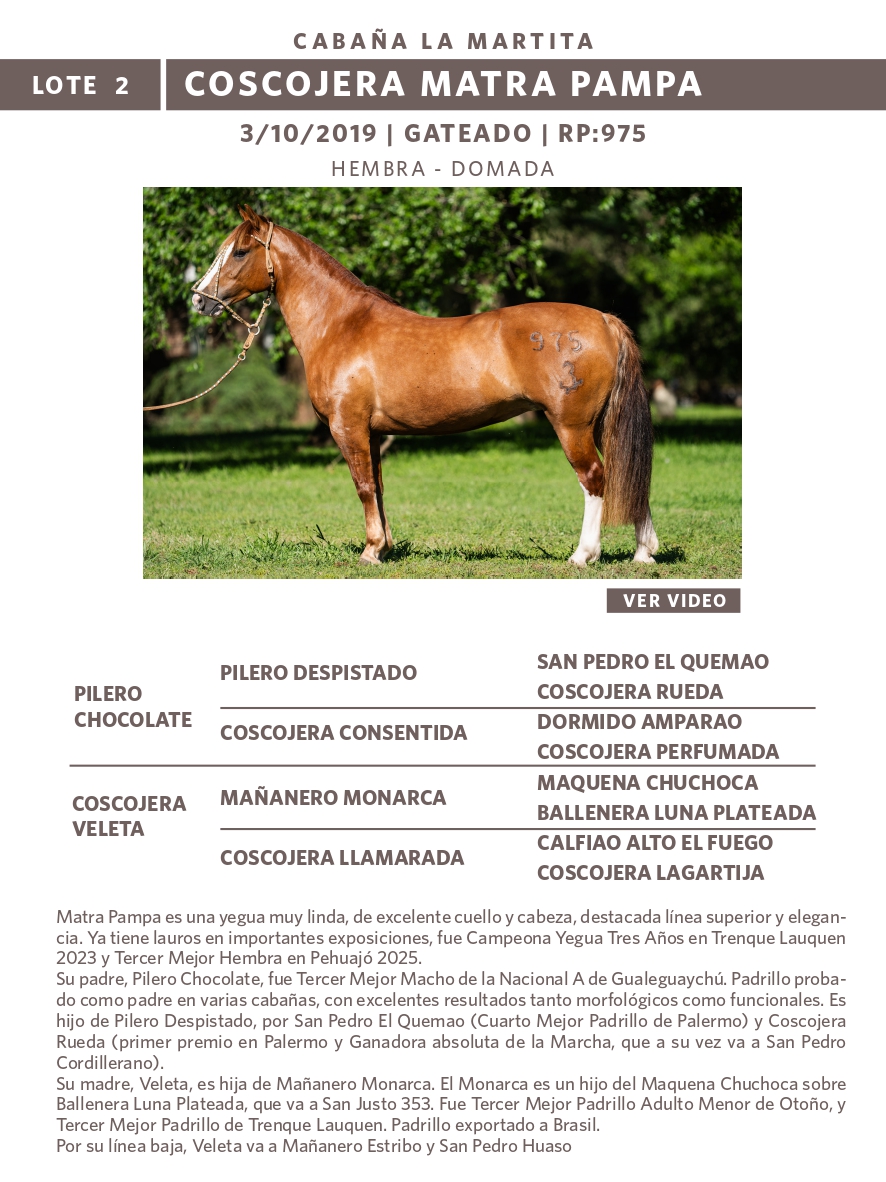 LOTE 2, COSCOJERA MATRA PAMPA 🔥 🔥 🔥 Lote Anterior Volver al remate Lote Siguiente Ficha Contacto Ofertar Buenos Aires - Ficha del Lote Identificador: #345600 Categoría: Yegua de andar Altura: 1,42 Torax: 1,83 Caña: 19 RP: 975 Pedigree Buenos Aires - Ofertar Fecha de cierre: 28 de Octubre a las 15:00hs. Aún no tiene ofertas Plazo: Contado 30 días 45 días 60 días 90 días 120 días 180 días Contado, 30 y 60 dias Su Oferta en $: − + Step: -20.000,00 / +20.000,00 Programar puja hasta: Programar puja hasta Aumentar puja programada 440000 800000 **Oferta al bulto Iniciar sesión para ofertar Ofertar Compra por $ 99.000.000,00 Ofertas Recibidas $ Fecha/Hora Estado Este lote aún no tiene preofertas. ¿Estás seguro de comprar el LOTE COSCOJERA MATRA PAMPA por $ 99000000 ? 531 Visualizaciones ClicData Contacto Empresa: El Rincón Criollos Nombre*: Teléfono* : E-mail* : Mensaje Enviar Registrese gratis Este contenido Exclusivo está disponible sólo para usuarios registrados Ingresar