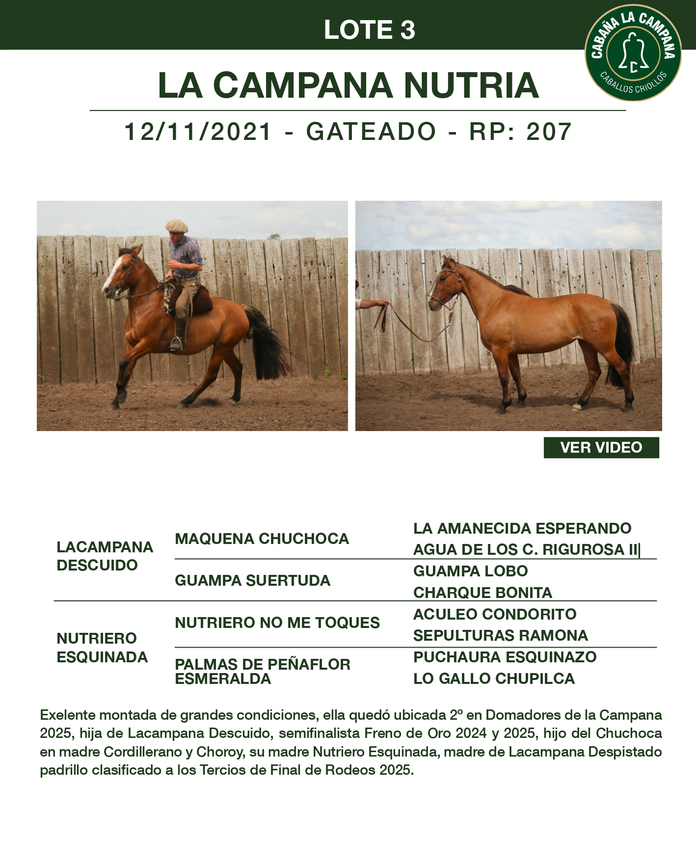 LOTE 3, LACAMPANA NUTRIA Lote Anterior Volver al remate Lote Siguiente Ficha Contacto Ofertar Buenos Aires - Ficha del Lote Identificador: #346162 Categoría: Yeguas Montadas RP: 207 Pedigree Buenos Aires - Ofertar Fecha de cierre: 01 de Noviembre a las 12:00hs. Aún no tiene ofertas Plazo: Contado 30 días 45 días 60 días 90 días 120 días 180 días Contado, 30 y 60 dias Su Oferta en $: − + Step: -20.000,00 / +20.000,00 Programar puja hasta: Programar puja hasta Aumentar puja programada 490000 850000 **Oferta al bulto Iniciar sesión para ofertar Ofertar Compra por $ 99.000.000,00 Ofertas Recibidas $ Fecha/Hora Estado Este lote aún no tiene preofertas. ¿Estás seguro de comprar el LOTE LACAMPANA NUTRIA por $ 99000000 ? 123 Visualizaciones ClicData Contacto Empresa: El Rincón Criollos Nombre*: Teléfono* : E-mail* : Mensaje Enviar Registrese gratis Este contenido Exclusivo está disponible sólo para usuarios registrados Ingresar