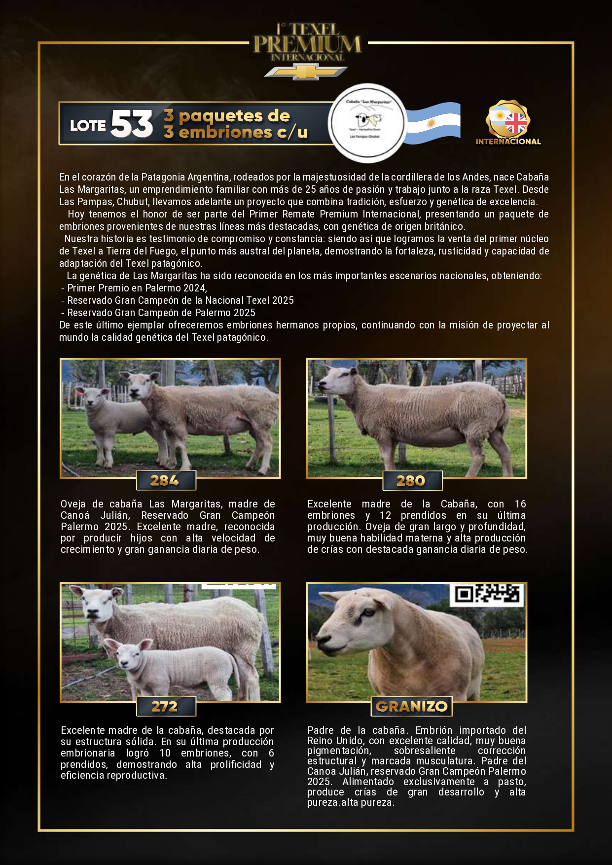LOTE 53 - Cabaña "Las Margaritas" RP 284, Embrion ovino a remate en 1º Texel Premium Internacional, Buenos Aires 🔥 🔥 🔥 Lote Anterior Volver al remate Lote Siguiente Ficha Contacto Ofertar Buenos Aires - Ficha del Lote Identificador: #349648 Categoría: Embrion ovino Pedigree Plazo 12 cuotas Información Genética RP 284 RP 284 PRECIO BASE 150.00 RP Granizo RP Granizo PRECIO BASE 150.00 Buenos Aires - Ofertar Fecha de cierre: 22 de Noviembre a las 16:00hs. Aún no tiene ofertas Animales: 284 Granizo Plazo: Contado 30 días 45 días 60 días 90 días 120 días 180 días Contado, 30 y 60 dias Su Oferta en U$S: (por 12 cuotas) − + Step: -10,00 / +10,00 Programar puja hasta: Programar puja hasta Aumentar puja programada 170 350 Iniciar sesión para ofertar Ofertar Compra por U$S 99.000.000,00 Ofertas Recibidas U$S Fecha/Hora Estado Este lote aún no tiene preofertas. ¿Estás seguro de comprar el LOTE Embrion ovino a remate en 1º Texel Premium Internacional, Buenos Aires por 12 cuotas de U$S 99000000 ? 148 Visualizaciones ClicData Contacto Empresa: JUAN FRANCISCO CHIRUCHI Nombre*: Teléfono* : E-mail* : Mensaje Por informes y consultas 099977007 Enviar Registrese gratis Este contenido Exclusivo está disponible sólo para usuarios registrados Ingresar