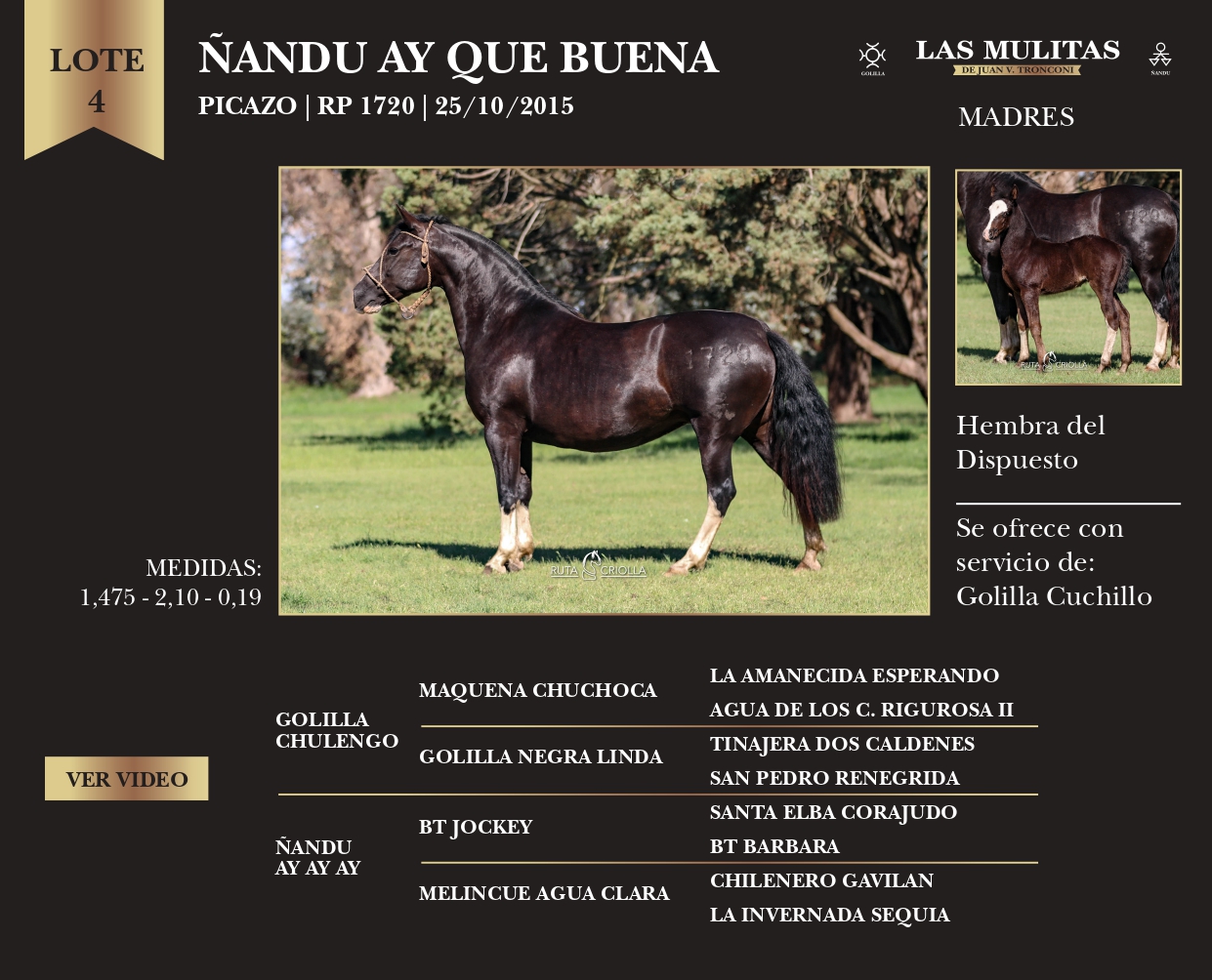 LOTE 4, Ñandu Ay Que Buena 🔥 🔥 🔥 Lote Anterior Volver al remate Lote Siguiente Ficha Contacto Ofertar Buenos Aires - Ficha del Lote Identificador: #349734 Categoría: Yeguas Altura: 1,475 Torax: 2,10 Caña: 0,19 Pedigree Descripción: Preñez: Se ofrece con servicio de: Cuchillo Cría: Hembra del Dispuesto Buenos Aires - Ofertar Fecha de cierre: 26 de Noviembre a las 15:00hs. Aún no tiene ofertas Plazo: Contado 30 días 45 días 60 días 90 días 120 días 180 días Contado, 30 y 60 dias Su Oferta en $: − + Step: -20.000,00 / +20.000,00 Programar puja hasta: Programar puja hasta Aumentar puja programada 540000 900000 **Oferta al bulto Iniciar sesión para ofertar Ofertar Compra por $ 99.000.000,00 Ofertas Recibidas $ Fecha/Hora Estado Este lote aún no tiene preofertas. ¿Estás seguro de comprar el LOTE Ñandu Ay Que Buena por $ 99000000 ? 825 Visualizaciones ClicData Contacto Empresa: El Rincón Criollos Nombre*: Teléfono* : E-mail* : Mensaje Enviar Registrese gratis Este contenido Exclusivo está disponible sólo para usuarios registrados Ingresar