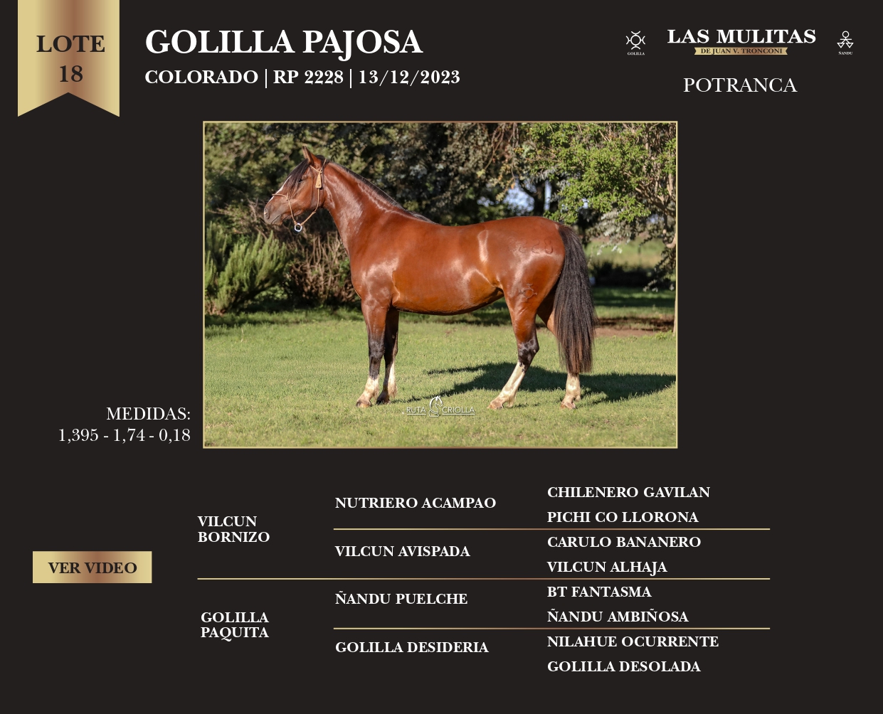 LOTE 18, Golilla Pajosa Lote Anterior Volver al remate Lote Siguiente Ficha Contacto Ofertar Buenos Aires - Ficha del Lote Identificador: #349748 Categoría: Potrancas Altura: 1,395 Torax: 1,74 Caña: 0,18 Pedigree Buenos Aires - Ofertar Fecha de cierre: 26 de Noviembre a las 15:00hs. Aún no tiene ofertas Plazo: Contado 30 días 45 días 60 días 90 días 120 días 180 días Contado, 30 y 60 dias Su Oferta en $: − + Step: -20.000,00 / +20.000,00 Programar puja hasta: Programar puja hasta Aumentar puja programada 840000 1200000 **Oferta al bulto Iniciar sesión para ofertar Ofertar Compra por $ 99.000.000,00 Ofertas Recibidas $ Fecha/Hora Estado Este lote aún no tiene preofertas. ¿Estás seguro de comprar el LOTE Golilla Pajosa por $ 99000000 ? 413 Visualizaciones ClicData Contacto Empresa: El Rincón Criollos Nombre*: Teléfono* : E-mail* : Mensaje Enviar Registrese gratis Este contenido Exclusivo está disponible sólo para usuarios registrados Ingresar