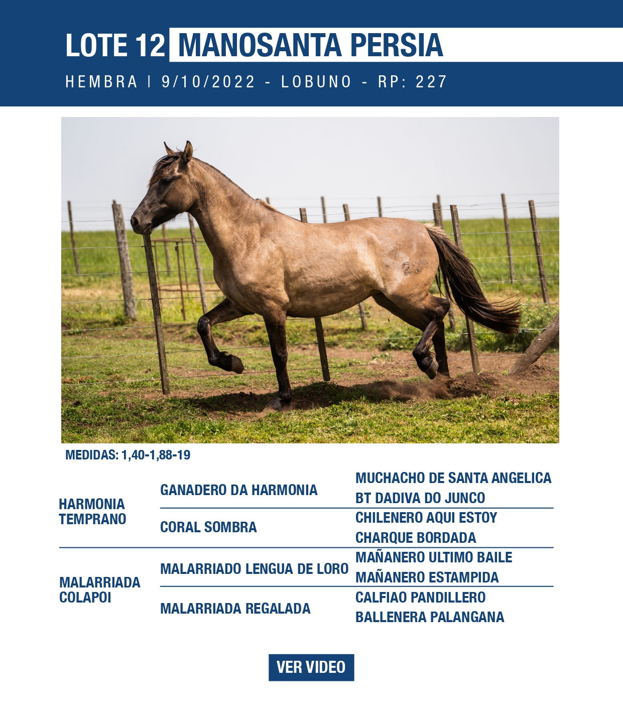 LOTE 12, MANOSANTA PERSIA 🔥 🔥 🔥 Lote Anterior Volver al remate Lote Siguiente Ficha Contacto Ofertar Buenos Aires - Ficha del Lote Identificador: #352700 Categoría: Yeguas Altura: 1,40 Torax: 1,88 Caña: 19 Pedigree Buenos Aires - Ofertar Fecha de cierre: 12 de Diciembre a las 15:00hs. Aún no tiene ofertas Plazo: Contado 30 días 45 días 60 días 90 días 120 días 180 días Contado, 30 y 60 dias Su Oferta en $: − + Step: -20.000,00 / +20.000,00 Programar puja hasta: Programar puja hasta Aumentar puja programada 590000 950000 **Oferta al bulto Iniciar sesión para ofertar Ofertar Compra por $ 99.000.000,00 Ofertas Recibidas $ Fecha/Hora Estado Este lote aún no tiene preofertas. ¿Estás seguro de comprar el LOTE MANOSANTA PERSIA por $ 99000000 ? 36 Visualizaciones ClicData Contacto Empresa: El Rincón Criollos Nombre*: Teléfono* : E-mail* : Mensaje Enviar Registrese gratis Este contenido Exclusivo está disponible sólo para usuarios registrados Ingresar