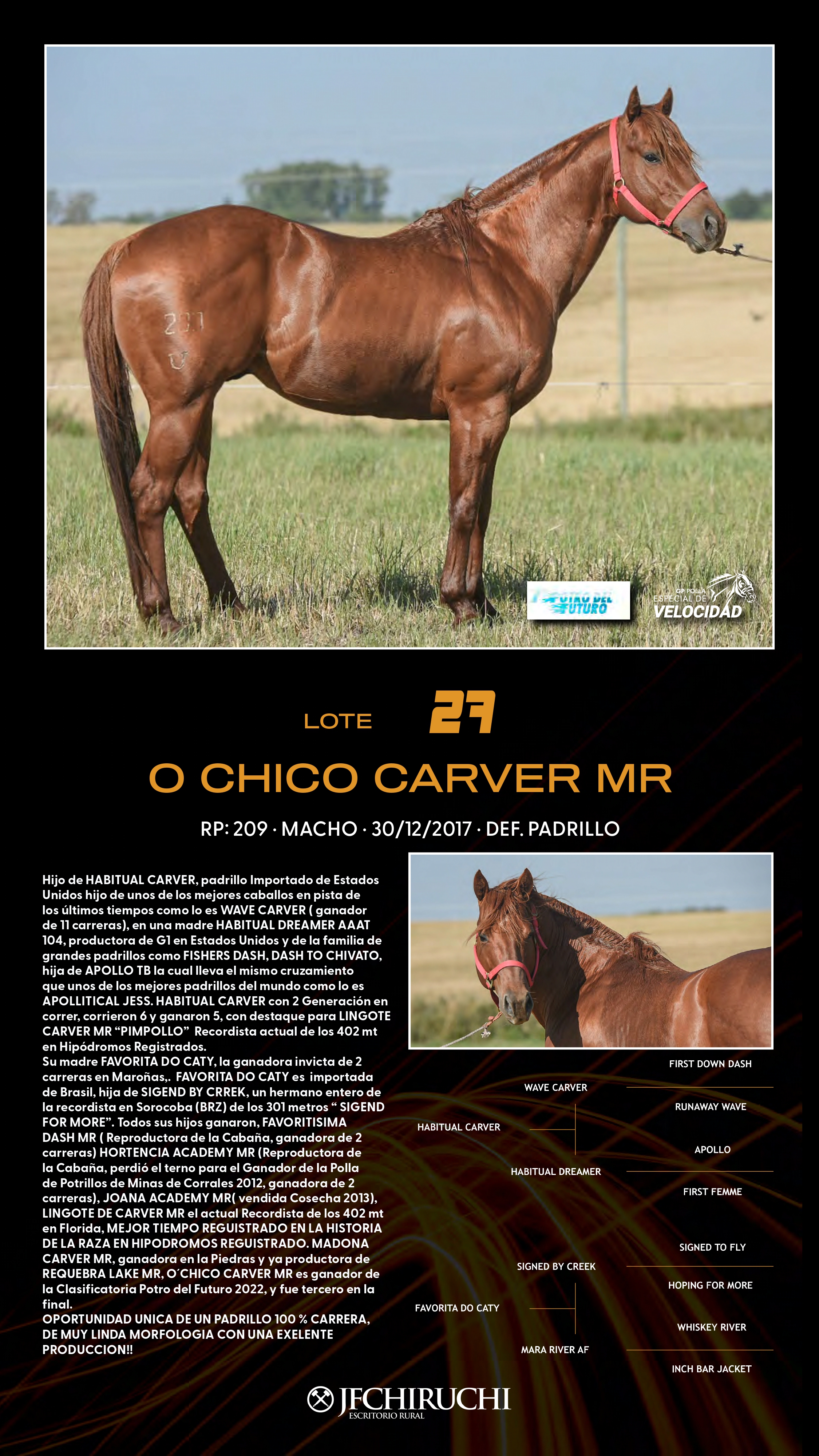 LOTE 27, O CHICO CARVER MR 🔥 🔥 🔥 Lote Anterior Volver al remate Lote Siguiente Ficha Contacto San José - Ficha del Lote Identificador: #352958 Categoría: Padrillo RP: 209 Pedigree San José - 14 Visualizaciones ClicData Contacto Empresa: JUAN FRANCISCO CHIRUCHI Nombre*: Teléfono* : E-mail* : Mensaje Por informes y consultas 099977007 Enviar Registrese gratis Este contenido Exclusivo está disponible sólo para usuarios registrados Ingresar