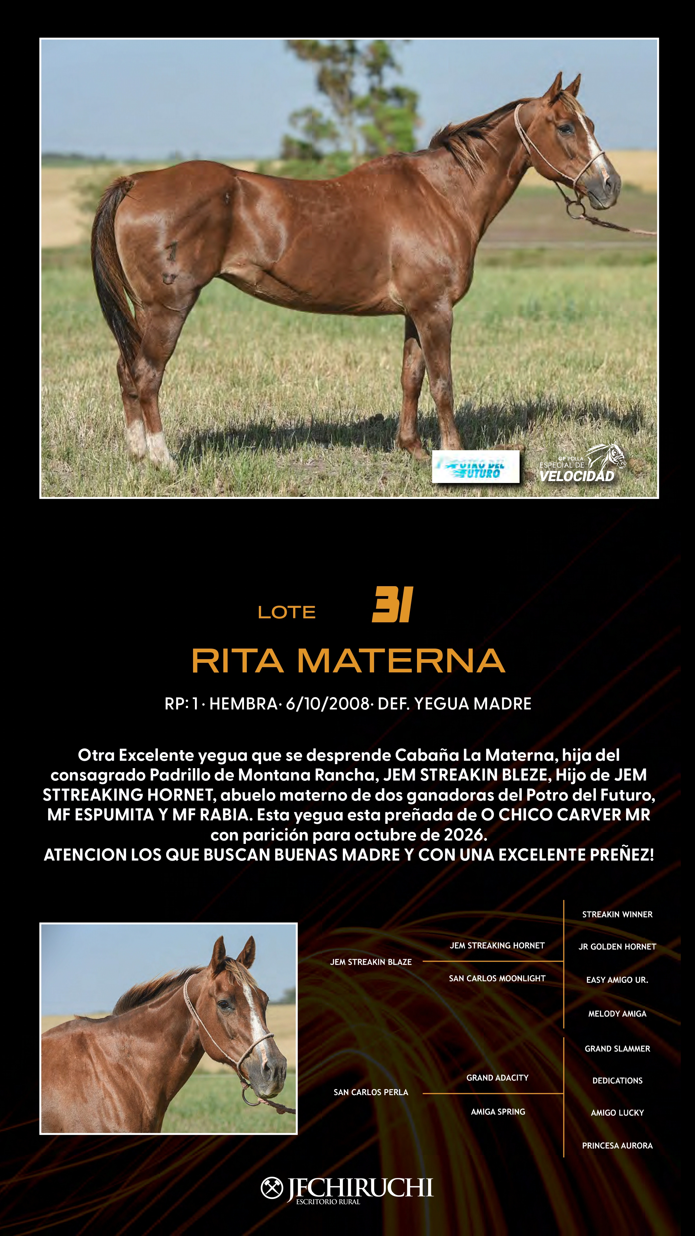 LOTE 31, RITA MATERNA Lote Anterior Volver al remate Ficha Contacto San José - Ficha del Lote Identificador: #352961 Categoría: Yegua Madre RP: 1 Pedigree San José - 8 Visualizaciones ClicData Contacto Empresa: JUAN FRANCISCO CHIRUCHI Nombre*: Teléfono* : E-mail* : Mensaje Por informes y consultas 099977007 Enviar Registrese gratis Este contenido Exclusivo está disponible sólo para usuarios registrados Ingresar
