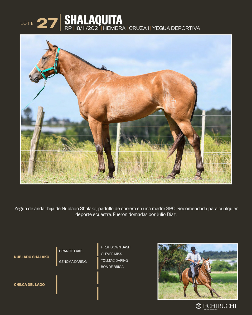 LOTE 27, SHALAQUITA Lote Anterior Volver al remate Lote Siguiente Ficha Contacto Artigas - Ficha del Lote Identificador: #356310 Categoría: Yegua Artigas - 13 Visualizaciones ClicData Contacto Empresa: JUAN FRANCISCO CHIRUCHI Nombre*: Teléfono* : E-mail* : Mensaje Por informes y consultas 099977007 Enviar Registrese gratis Este contenido Exclusivo está disponible sólo para usuarios registrados Ingresar