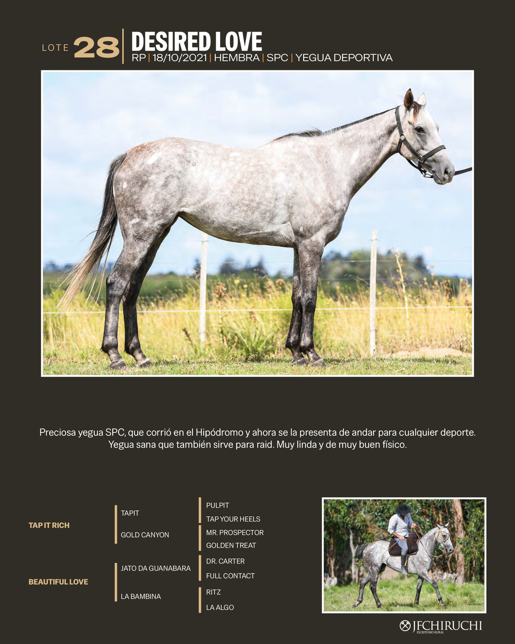LOTE 28, DESIRED LOVE Lote Anterior Volver al remate Lote Siguiente Ficha Contacto Artigas - Ficha del Lote Identificador: #356322 Categoría: Yegua Artigas - 18 Visualizaciones ClicData Contacto Empresa: JUAN FRANCISCO CHIRUCHI Nombre*: Teléfono* : E-mail* : Mensaje Por informes y consultas 099977007 Enviar Registrese gratis Este contenido Exclusivo está disponible sólo para usuarios registrados Ingresar