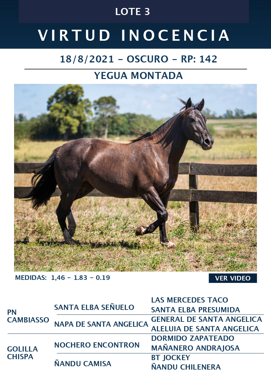 LOTE 3, VIRTUD INOCENCIA 🔥 🔥 🔥 Lote Anterior Volver al remate Lote Siguiente Ficha Contacto Ofertar Buenos Aires - Ficha del Lote Identificador: #359325 Categoría: Yegua de andar RP: 142 Pedigree Buenos Aires - Ofertar Fecha de cierre: 09 de Marzo a las 15:00hs. Aún no tiene ofertas Plazo: Contado 30 días 45 días 60 días 90 días 120 días 180 días Contado, 30 y 60 dias Su Oferta en $: − + Step: -20.000,00 / +20.000,00 Programar puja hasta: Programar puja hasta Aumentar puja programada 540000 900000 **Oferta al bulto Iniciar sesión para ofertar Ofertar Compra por $ 99.000.000,00 Ofertas Recibidas $ Fecha/Hora Estado Este lote aún no tiene preofertas. ¿Estás seguro de comprar el LOTE VIRTUD INOCENCIA por $ 99000000 ? 286 Visualizaciones ClicData Contacto Empresa: El Rincón Criollos Nombre*: Teléfono* : E-mail* : Mensaje Enviar Registrese gratis Este contenido Exclusivo está disponible sólo para usuarios registrados Ingresar