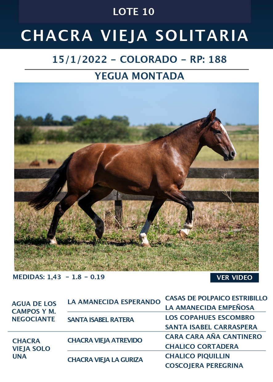 LOTE 10, CHACRA VIEJA SOLITARIA 🔥 🔥 🔥 Lote Anterior Volver al remate Lote Siguiente Ficha Contacto Ofertar Buenos Aires - Ficha del Lote Identificador: #359332 Categoría: Yegua de andar RP: 188 Pedigree Buenos Aires - Ofertar Fecha de cierre: 09 de Marzo a las 15:00hs. Aún no tiene ofertas Plazo: Contado 30 días 45 días 60 días 90 días 120 días 180 días Contado, 30 y 60 dias Su Oferta en $: − + Step: -20.000,00 / +20.000,00 Programar puja hasta: Programar puja hasta Aumentar puja programada 560000 920000 **Oferta al bulto Iniciar sesión para ofertar Ofertar Compra por $ 99.000.000,00 Ofertas Recibidas $ Fecha/Hora Estado Este lote aún no tiene preofertas. ¿Estás seguro de comprar el LOTE CHACRA VIEJA SOLITARIA por $ 99000000 ? 226 Visualizaciones ClicData Contacto Empresa: El Rincón Criollos Nombre*: Teléfono* : E-mail* : Mensaje Enviar Registrese gratis Este contenido Exclusivo está disponible sólo para usuarios registrados Ingresar