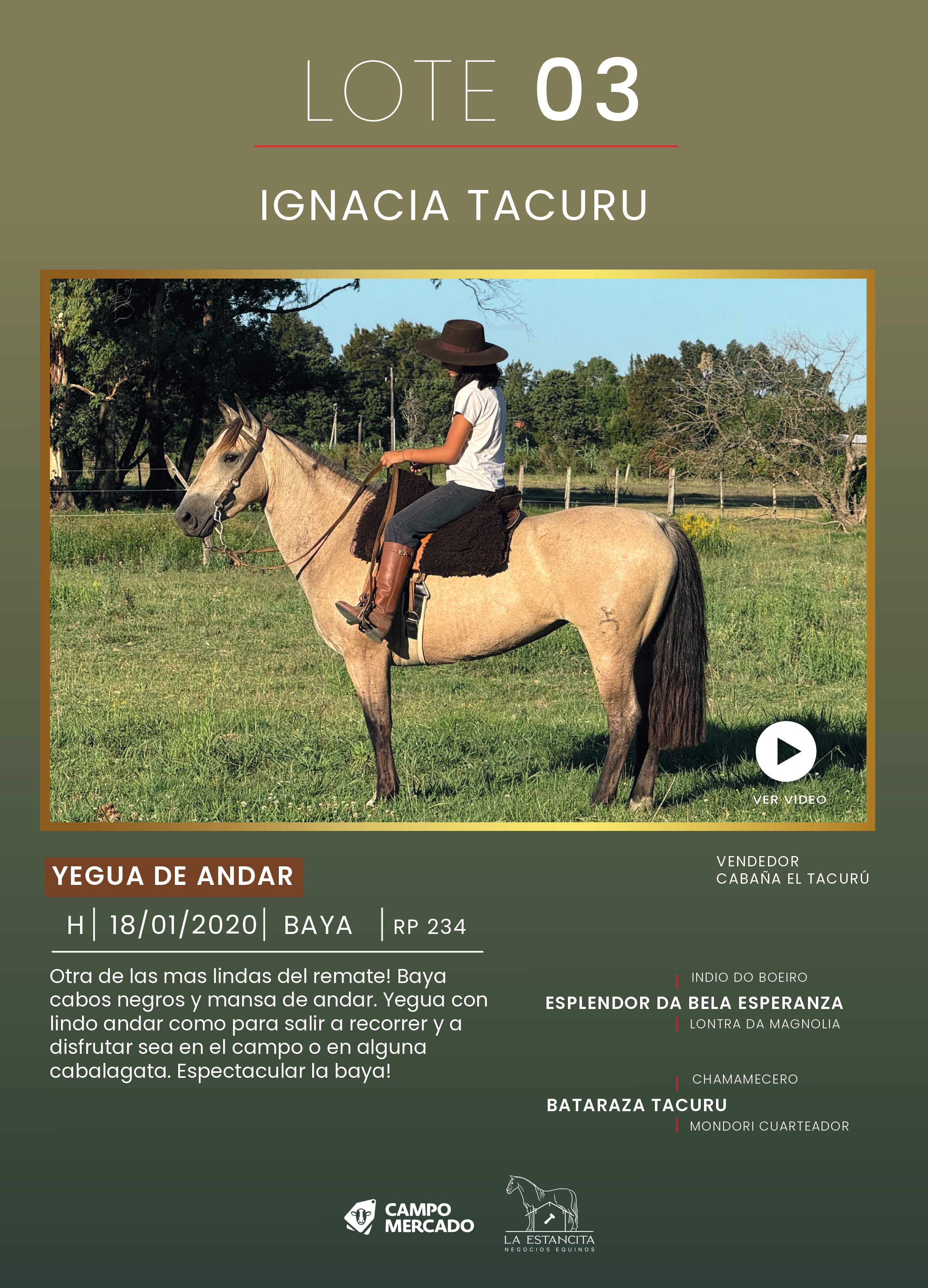LOTE 3, IGNACIA TACURU Lote Anterior Volver al remate Lote Siguiente Ficha Contacto Montevideo - Ficha del Lote Identificador: #359904 Categoría: Yegua de andar Pedigree Montevideo - 30 Visualizaciones ClicData Contacto Empresa: La Estancita Negocios Equinos Nombre*: Teléfono* : E-mail* : Mensaje Enviar Registrese gratis Este contenido Exclusivo está disponible sólo para usuarios registrados Ingresar