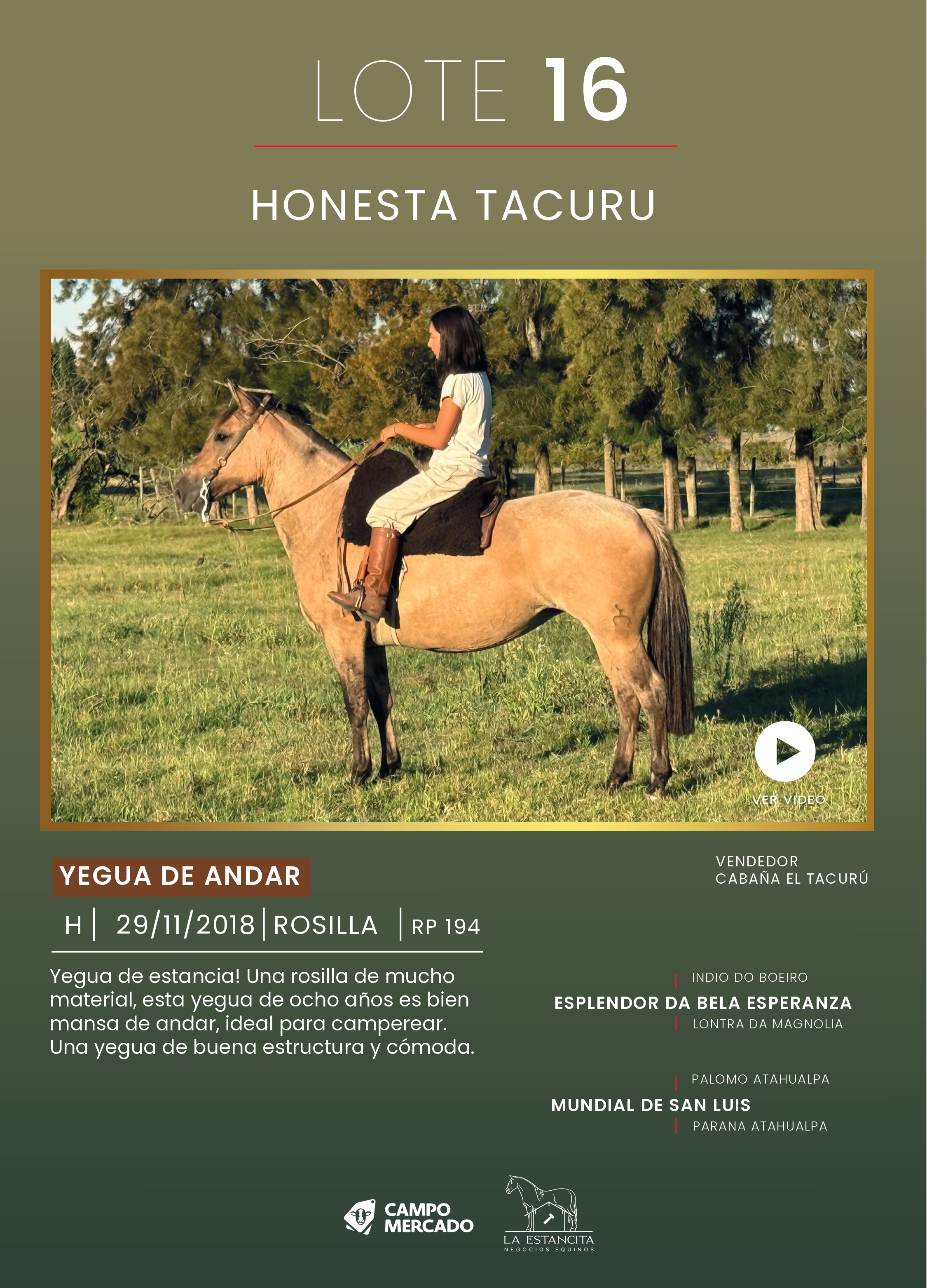 LOTE 16, HONESTA TACURU Lote Anterior Volver al remate Lote Siguiente Ficha Contacto Montevideo - Ficha del Lote Identificador: #359917 Categoría: Yegua de andar Pedigree Montevideo - 19 Visualizaciones ClicData Contacto Empresa: La Estancita Negocios Equinos Nombre*: Teléfono* : E-mail* : Mensaje Enviar Registrese gratis Este contenido Exclusivo está disponible sólo para usuarios registrados Ingresar