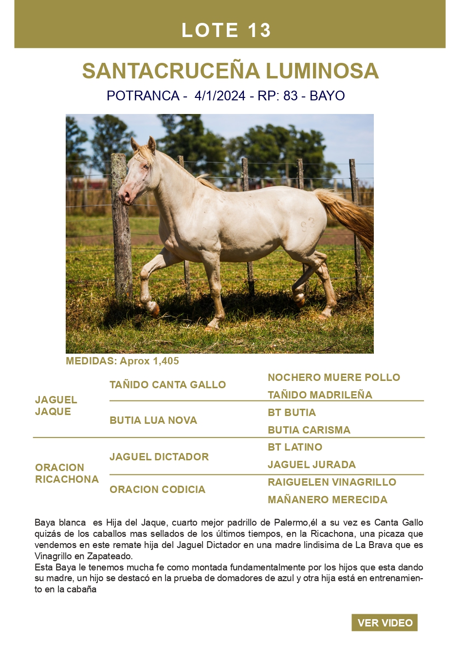 LOTE 13, SANTACRUCEÑA LUMINOSA Lote Anterior Volver al remate Lote Siguiente Ficha Contacto Ofertar Buenos Aires - Ficha del Lote Identificador: #359975 Categoría: Potrancas Pedigree Buenos Aires - Ofertar Fecha de cierre: 17 de Marzo a las 15:00hs. Aún no tiene ofertas Plazo: Contado 30 días 45 días 60 días 90 días 120 días 180 días Contado, 30 y 60 dias Su Oferta en $: − + Step: -25.000,00 / +25.000,00 Programar puja hasta: Programar puja hasta Aumentar puja programada 425000 875000 **Oferta al bulto Iniciar sesión para ofertar Ofertar Compra por $ 99.000.000,00 Ofertas Recibidas $ Fecha/Hora Estado Este lote aún no tiene preofertas. ¿Estás seguro de comprar el LOTE SANTACRUCEÑA LUMINOSA por $ 99000000 ? 121 Visualizaciones ClicData Contacto Empresa: El Rincón Criollos Nombre*: Teléfono* : E-mail* : Mensaje Enviar Registrese gratis Este contenido Exclusivo está disponible sólo para usuarios registrados Ingresar