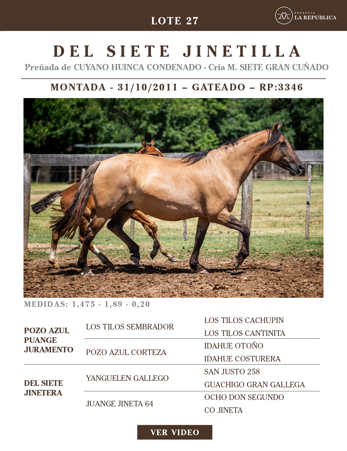 LOTE 27, DEL SIETE JINETILLA 🔥 🔥 🔥 Lote Anterior Volver al remate Lote Siguiente Ficha Contacto Ofertar Buenos Aires - Ficha del Lote Identificador: #363804 Categoría: Yeguas Montadas RP: 3346 Pedigree Plazo 18 cuotas Buenos Aires - Ofertar Fecha de cierre: 31 de Marzo a las 15:00hs. Prórroga: 2 minutos Aún no tiene ofertas Plazo: Contado 30 días 45 días 60 días 90 días 120 días 180 días Contado, 30 y 60 dias Su Oferta en $: (por 18 cuotas) − + Step: -50.000,00 / +50.000,00 Programar puja hasta: Programar puja hasta Aumentar puja programada 600000 1500000 Iniciar sesión para ofertar Ofertar Compra por $ 99.000.000,00 Ofertas Recibidas $ Fecha/Hora Estado Este lote aún no tiene preofertas. ¿Estás seguro de comprar el LOTE DEL SIETE JINETILLA por 18 cuotas de $ 99000000 ? 216 Visualizaciones ClicData Contacto Empresa: El Rincón Criollos Nombre*: Teléfono* : E-mail* : Mensaje Enviar Registrese gratis Este contenido Exclusivo está disponible sólo para usuarios registrados Ingresar