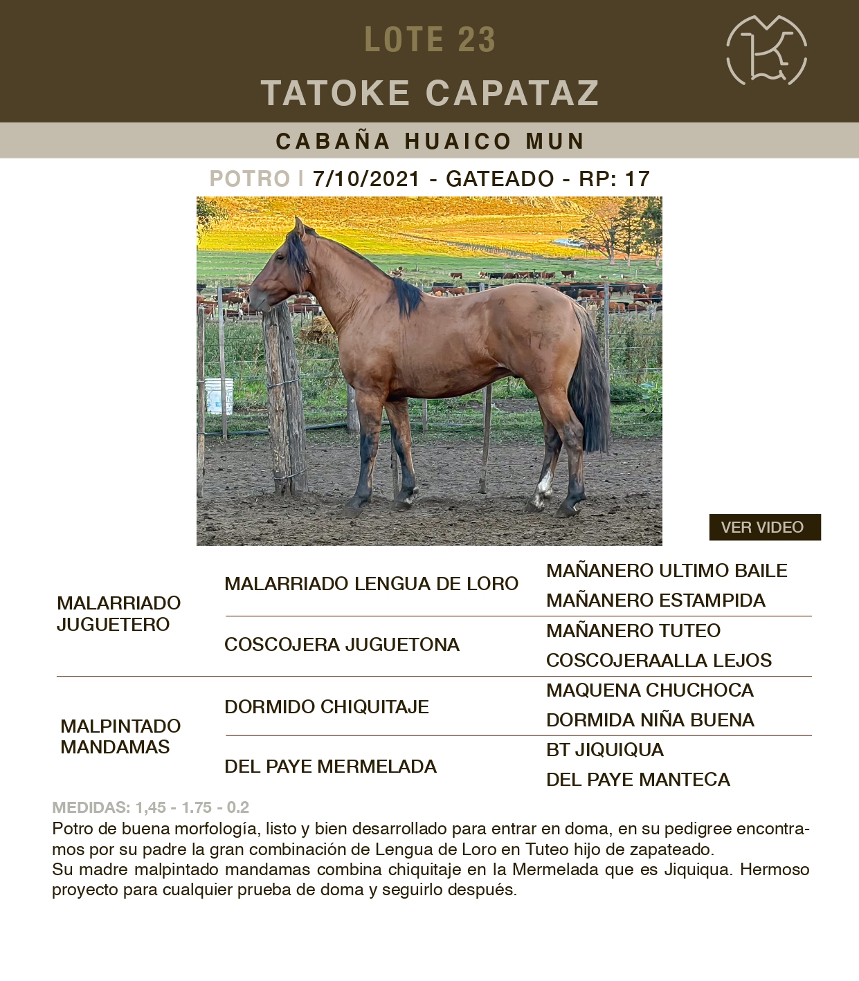 LOTE 23, Tatoke Capataz Lote Anterior Volver al remate Lote Siguiente Ficha Contacto Ofertar Buenos Aires - Ficha del Lote Identificador: #365796 Categoría: Potros RP: 17 Pedigree Plazo 15 cuotas Buenos Aires - Ofertar Fecha de cierre: 14 de Abril a las 15:00hs. Aún no tiene ofertas Plazo: Contado 30 días 45 días 60 días 90 días 120 días 180 días Contado, 30 y 60 dias Su Oferta en $: (por 15 cuotas) − + Step: -20.000,00 / +20.000,00 Programar puja hasta: Programar puja hasta Aumentar puja programada 220000 580000 Iniciar sesión para ofertar Ofertar Compra por $ 99.000.000,00 Ofertas Recibidas $ Fecha/Hora Estado Este lote aún no tiene preofertas. ¿Estás seguro de comprar el LOTE Tatoke Capataz por 15 cuotas de $ 99000000 ? 152 Visualizaciones ClicData Contacto Empresa: El Rincón Criollos Nombre*: Teléfono* : E-mail* : Mensaje Enviar Registrese gratis Este contenido Exclusivo está disponible sólo para usuarios registrados Ingresar
