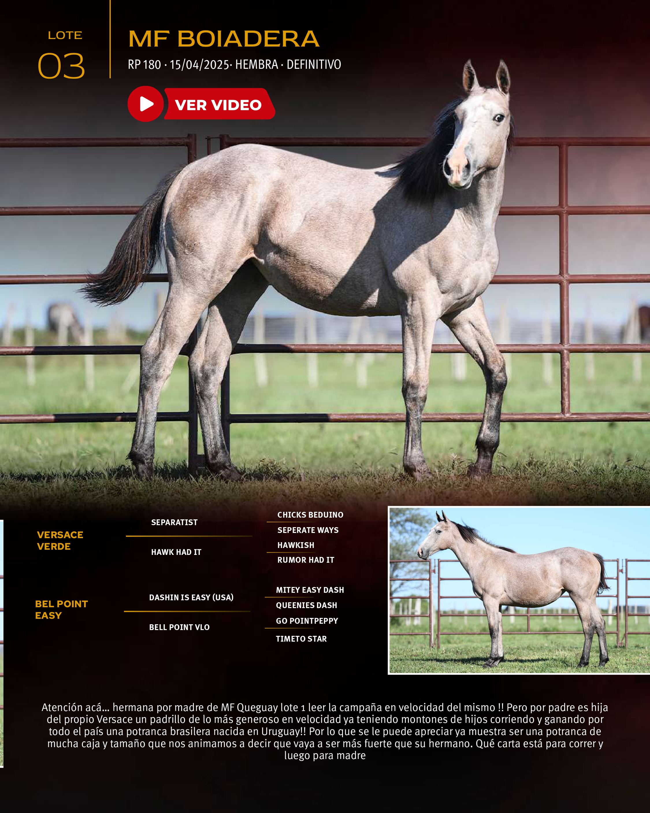LOTE 3, MF BOIADERA 🔥 🔥 🔥 Lote Anterior Volver al remate Lote Siguiente Ficha Contacto Ofertar San José - Ficha del Lote Identificador: #367412 Categoría: Yegua RP: 180 Pedigree San José - Ofertar Fecha de cierre: 23 de Abril a las 17:00hs. Aún no tiene ofertas Plazo: Contado 30 días 45 días 60 días 90 días 120 días 180 días Contado, 30 y 60 dias Su Oferta en U$S: − + Step: -10,00 / +10,00 Programar puja hasta: Programar puja hasta Aumentar puja programada 220 400 **Oferta al bulto Iniciar sesión para ofertar Ofertar Compra por U$S 99.000.000,00 Ofertas Recibidas U$S Fecha/Hora Estado Este lote aún no tiene preofertas. ¿Estás seguro de comprar el LOTE MF BOIADERA por U$S 99000000 ? 55 Visualizaciones ClicData Contacto Empresa: JUAN FRANCISCO CHIRUCHI Nombre*: Teléfono* : E-mail* : Mensaje Por informes y consultas 099977007 Enviar Registrese gratis Este contenido Exclusivo está disponible sólo para usuarios registrados Ingresar