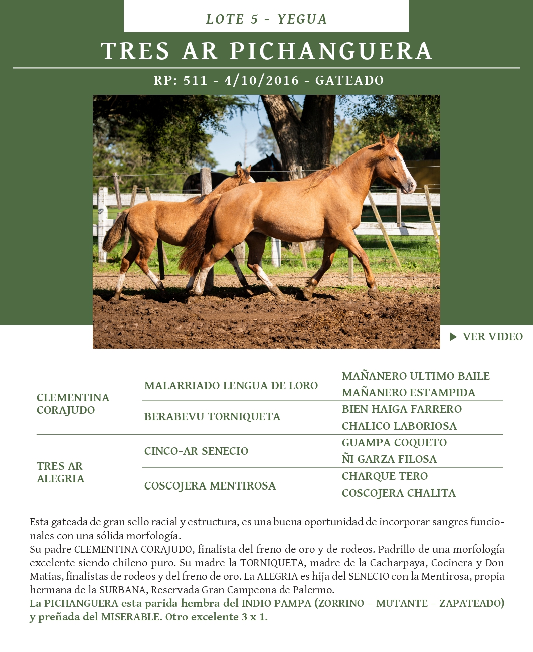 LOTE 5, TRES AR PICHANGUERA 🔥 🔥 🔥 Lote Anterior Volver al remate Lote Siguiente Ficha Contacto Buenos Aires - Ficha del Lote Identificador: #367457 Categoría: Yeguas RP: 511 Pedigree Buenos Aires - 63 Visualizaciones ClicData Contacto Empresa: El Rincón Criollos Nombre*: Teléfono* : E-mail* : Mensaje Enviar Registrese gratis Este contenido Exclusivo está disponible sólo para usuarios registrados Ingresar
