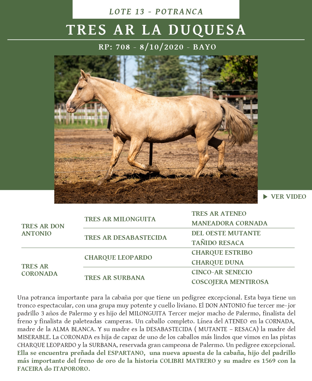 LOTE 13, TRES AR LA DUQUESA Lote Anterior Volver al remate Lote Siguiente Ficha Contacto Ofertar Buenos Aires - Ficha del Lote Identificador: #367465 Categoría: Potrancas Altura: 1,46 Torax: 1,98 Caña: 0,195 RP: 708 Pedigree Buenos Aires - Ofertar Fecha de cierre: 23 de Abril a las 15:00hs. Aún no tiene ofertas Plazo: Contado 30 días 45 días 60 días 90 días 120 días 180 días Contado, 30 y 60 dias Su Oferta en $: − + Step: -50.000,00 / +50.000,00 Programar puja hasta: Programar puja hasta Aumentar puja programada 600000 1500000 **Oferta al bulto Iniciar sesión para ofertar Ofertar Compra por $ 99.000.000,00 Ofertas Recibidas $ Fecha/Hora Estado Este lote aún no tiene preofertas. ¿Estás seguro de comprar el LOTE TRES AR LA DUQUESA por $ 99000000 ? 98 Visualizaciones ClicData Contacto Empresa: El Rincón Criollos Nombre*: Teléfono* : E-mail* : Mensaje Enviar Registrese gratis Este contenido Exclusivo está disponible sólo para usuarios registrados Ingresar