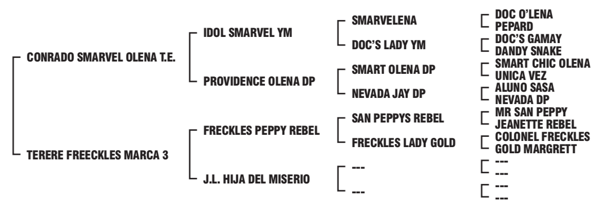 Yegua de manada hija de Conrado Smarvel Olena en madre Freckles Peppy Rebel, importado de USA y Gran Campeón Prado 1989.