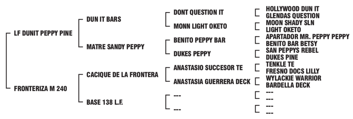 Yegua de manada domada, excelente productora con gran cruzamiento en su pedigre ya que tiene como abuelo a Dun It Bar y a Benito Peppy Bar, dos grandes padrillos productores de animales para toda modalidad.