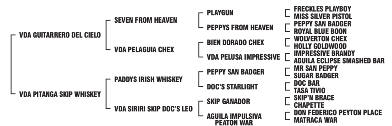 SEVEN FROM HEAVEN (USA): Campeón Mundial de AQHA en Aparte de Ganado (Cutting) categoría Junior. Finalista en 8 campeonatos de Cutting y Rienda con Ganado (Reined Cow Horse). Ganador de U$S 72.732 en premios. Padrillo residente en Four Sixes Ranch, USA, con un pedigree de línea funcional fuera de serie. Combina en sus ancestros reproductores que son líderes como Playgun, Royal Blue Boon y Peppy San Badger. Su producción ha sido excelente, de gran estructura, inteligencia, agilidad e instinto para el ganado. Ha producido ganadores de Cutting, Reined Cow Horse y Caballo de Estancia, demostrando que produce animales para todo tipo de pruebas. En Uruguay produjo a VdA Gringo Gun, VdA Solera del Cielo, VdA Ventolina del Cielo que compitieron en diversas pruebas funcionales con destacadas actuaciones.