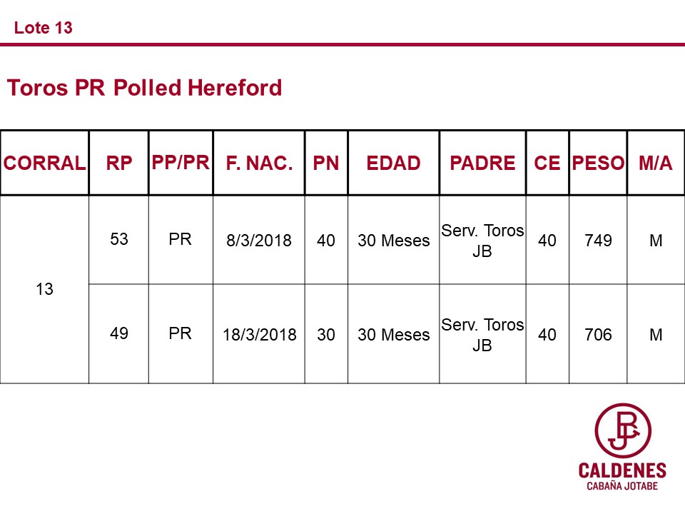 LOTE 13, TOROS PR 🔥 🔥 🔥 Lote Anterior Volver al remate Lote Siguiente Información del Lote Animales del Lote Pedigree Ofertar Contacto Buenos Aires - Información del Lote Identificador: #80205 Cantidad 2 Categoría Toros PR Raza Hereford Departamento Buenos Aires Plazo Consultar Buenos Aires - Ofertar Aún no tiene ofertas Animales: 53 49 Plazo: Contado 30 días 45 días 60 días 90 días 120 días 180 días Contado, 30 y 60 dias Su Oferta en $: − + Step: -5.000,00 / +5.000,00 Programar puja hasta: Programar puja hasta Aumentar puja programada 150000 240000 **Oferta al bulto Iniciar sesión para ofertar Ofertar Listado de preofertas $ Fecha/Hora Estado Este lote aún no tiene preofertas. 139 Visualizaciones ClicData Animales del Lote RP 53 49 PRECIO BASE 0.00 0.00 RP 53 PRECIO BASE 0.00 RP 49 PRECIO BASE 0.00 Pedigree Contacto Comercial a cargo: Paulo Empresa: Caldenes Agropecuaria Nombre*: E-mail* : Mensaje Por informes y consultas 03382 15 418112 Enviar Registrese gratis Este contenido Exclusivo está disponible sólo para usuarios registrados Ingresar