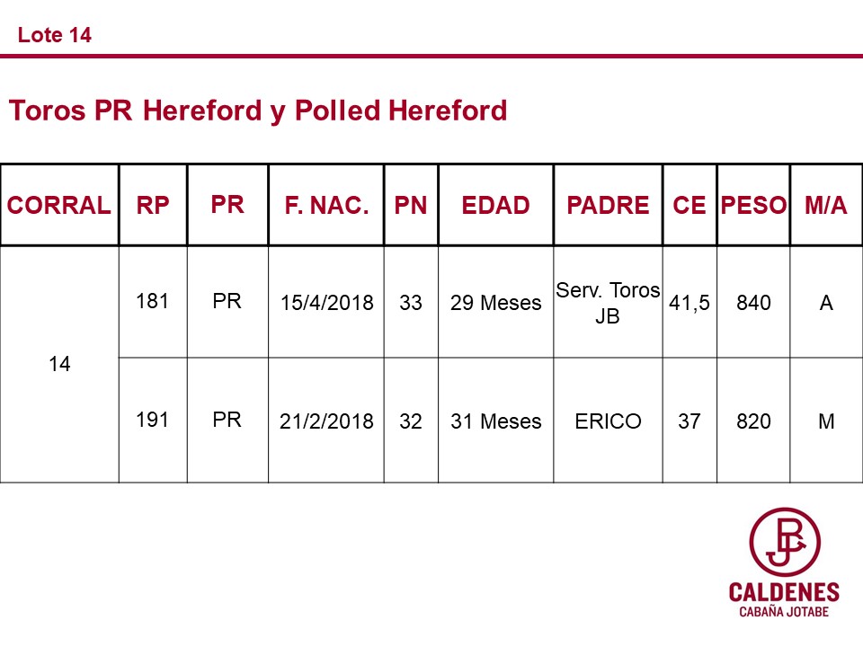 LOTE 14, TOROS PR 🔥 🔥 🔥 Lote Anterior Volver al remate Lote Siguiente Información del Lote Animales del Lote Pedigree Ofertar Contacto Buenos Aires - Información del Lote Identificador: #80220 Cantidad 2 Categoría Toros PR Raza Hereford Departamento Buenos Aires Plazo Consultar Buenos Aires - Ofertar Aún no tiene ofertas Animales: 181 191 Plazo: Contado 30 días 45 días 60 días 90 días 120 días 180 días Contado, 30 y 60 dias Su Oferta en $: − + Step: -5.000,00 / +5.000,00 Programar puja hasta: Programar puja hasta Aumentar puja programada 150000 240000 **Oferta al bulto Iniciar sesión para ofertar Ofertar Listado de preofertas $ Fecha/Hora Estado Este lote aún no tiene preofertas. 157 Visualizaciones ClicData Animales del Lote RP 181 191 PRECIO BASE 0.00 0.00 RP 181 PRECIO BASE 0.00 RP 191 PRECIO BASE 0.00 Pedigree Contacto Comercial a cargo: Paulo Empresa: Caldenes Agropecuaria Nombre*: E-mail* : Mensaje Por informes y consultas 03382 15 418112 Enviar Registrese gratis Este contenido Exclusivo está disponible sólo para usuarios registrados Ingresar