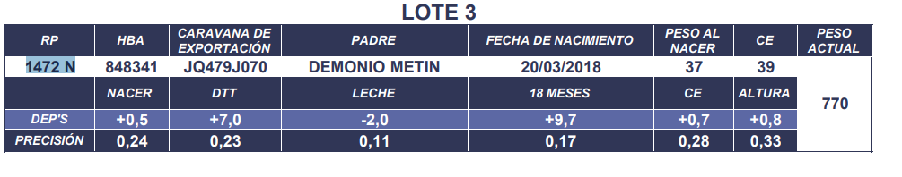 LOTE 3, TOROS PP 🔥 🔥 🔥 Lote Anterior Volver al remate Lote Siguiente Información del Lote Animal Pedigree Ofertar Contacto Buenos Aires - 9 de Julio Información del Lote Identificador: #80679 Categoría Toros PP Raza Angus Negro Departamento Buenos Aires Ubicación 9 de Julio Plazo Consultar Buenos Aires - 9 de Julio Ofertar Aún no tiene ofertas Animales: 1472 N Plazo: Contado 30 días 45 días 60 días 90 días 120 días 180 días Contado, 30 y 60 dias Su Oferta en $: − + Step: -3.000,00 / +3.000,00 Programar puja hasta: Programar puja hasta Aumentar puja programada 186000 240000 **Oferta al bulto Iniciar sesión para ofertar Ofertar Listado de preofertas $ Fecha/Hora Estado Este lote aún no tiene preofertas. 190 Visualizaciones ClicData Animal RP 1472 N PRECIO BASE 0.00 RP 1472 N PRECIO BASE 0.00 Pedigree Contacto Comercial a cargo: Cabaña La Cassina Empresa: La Cassina Nombre*: E-mail* : Mensaje Enviar Registrese gratis Este contenido Exclusivo está disponible sólo para usuarios registrados Ingresar